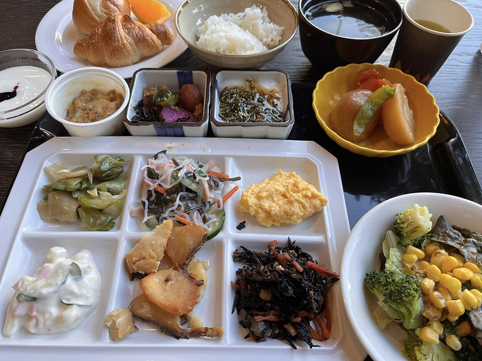 ホテルの朝ごはんバイキング。和食メニューが充実してて、つい朝からご飯がっつり食べてしまった。