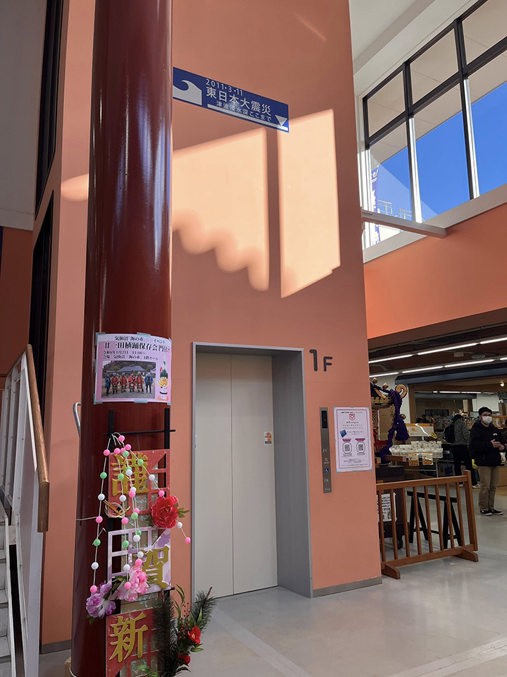 階段の横にエレベーターがあり、その上に「津波ここまで」の表示がある。ここは海のすぐ横、海抜0メートルだから海から来た津波をそのままの勢いで飲み込まれたのだろう。