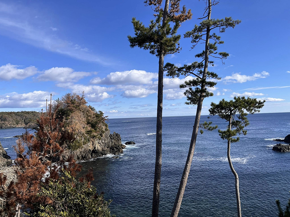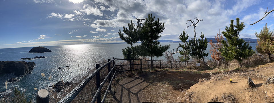 駐車スペースには車が数台停まっていた。そこから徒歩で公園内の坂を上り下りすると岬の先端にたどり着いた。途中松の木の落ち葉がたくさんあって滑りそうで怖かったので手すりにつかまりながら下りていった。