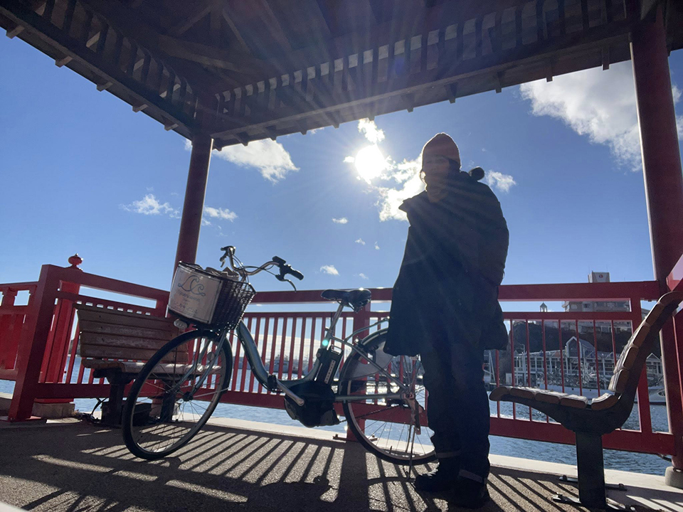 手前で電動ちゃりおくんと記念撮影してから橋を渡って大島へ。最南端の龍舞崎まで行くと灯台があって海が180度見渡せます!とのことなのでそこを目指した。アップダウンが結構あり、電動でよかったとホントに思った。てか、自転車で走ってるのは私くらいのものだ。もちろん歩いてる人もいない。30分くらい走っただろうか。ようやく龍舞崎に着いた。